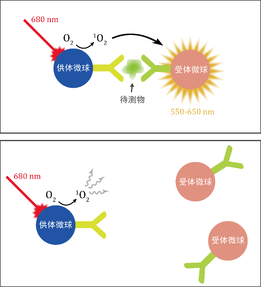 LOCI 分析技術(shù)主要依托「受體微球」與「供體微球」兩種聚合物納米微球?qū)崿F(xiàn)檢測(cè)。如圖 1 所示,檢測(cè)體系中存在待測(cè)物時(shí),兩種微球表面修飾的抗體與待測(cè)物發(fā)生免疫反應(yīng),形成免疫復(fù)合物。經(jīng)激發(fā)光照射檢測(cè)體系,復(fù)合物中的供體微球產(chǎn)生的單線態(tài)氧擴(kuò)散至受體微球,受體微球中的化學(xué)發(fā)光試劑捕獲單線態(tài)氧后產(chǎn)生光信號(hào)。由于單線態(tài)氧活性高、半衰期短,只有當(dāng)供體微球和受體微球距離足夠接近(形成免疫復(fù)合物)的情況下,供體微球釋放的單線態(tài)氧才能有效地到達(dá)受體微球,從而產(chǎn)生一系列化學(xué)反應(yīng),發(fā)射出反斯托克斯光信號(hào)。當(dāng)體系中不存在待測(cè)物時(shí),即不形成免疫復(fù)合物,游離供體微球產(chǎn)生的單線態(tài)氧快速在體系中耗散,幾乎不產(chǎn)生 LOCI 信號(hào)。以上就是 LOCI 分析技術(shù)的簡(jiǎn)要工作原理。